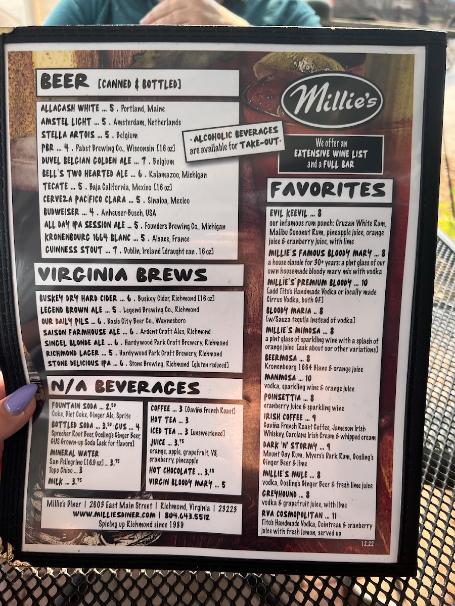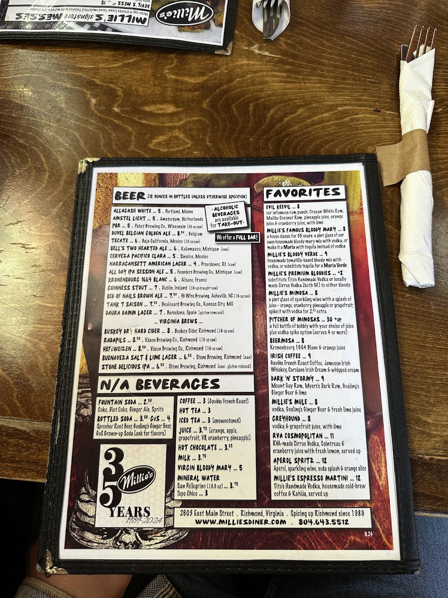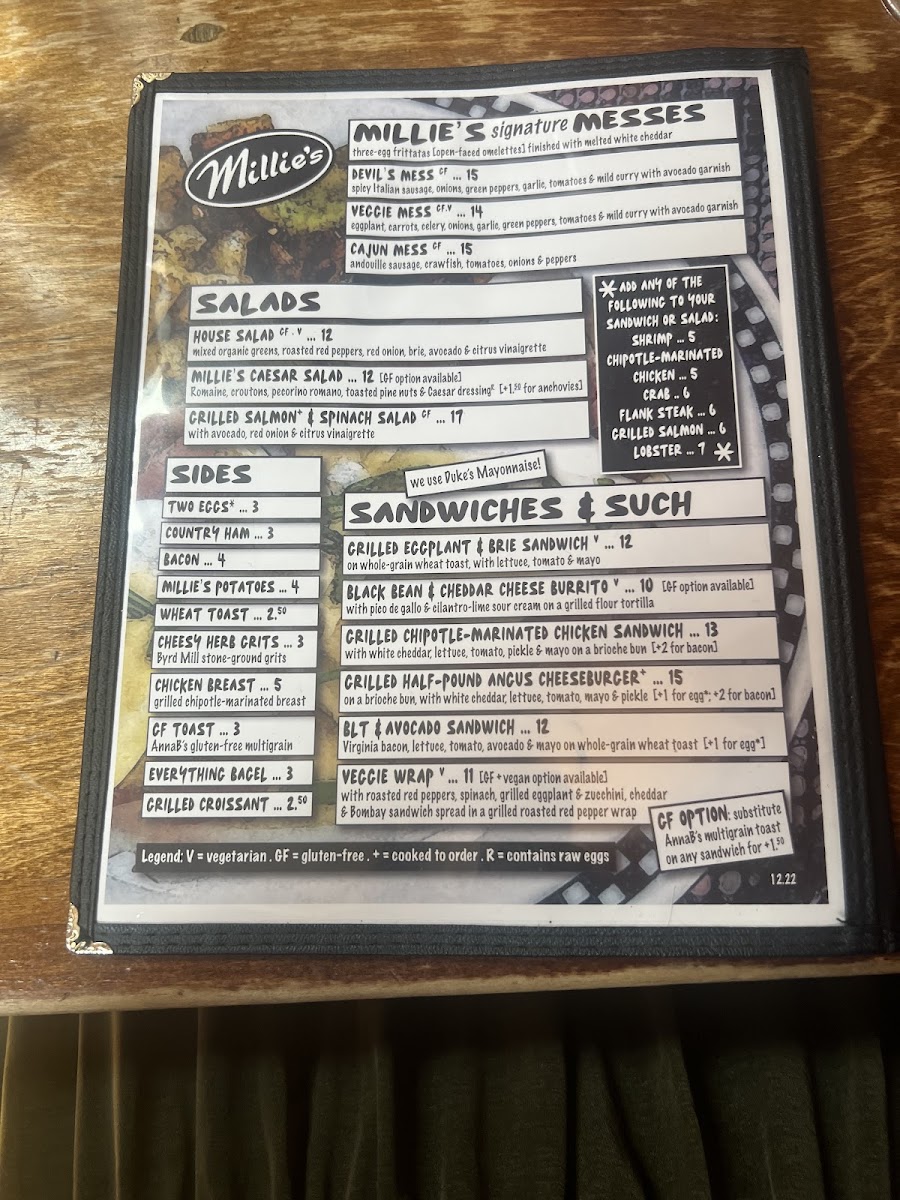 Millie’s famous sautéed shrimp & rice noodles with asparagus, shiitake mushrooms, red cabbage, sambal & coconut milk, garnished with cilantro, peanuts & lime